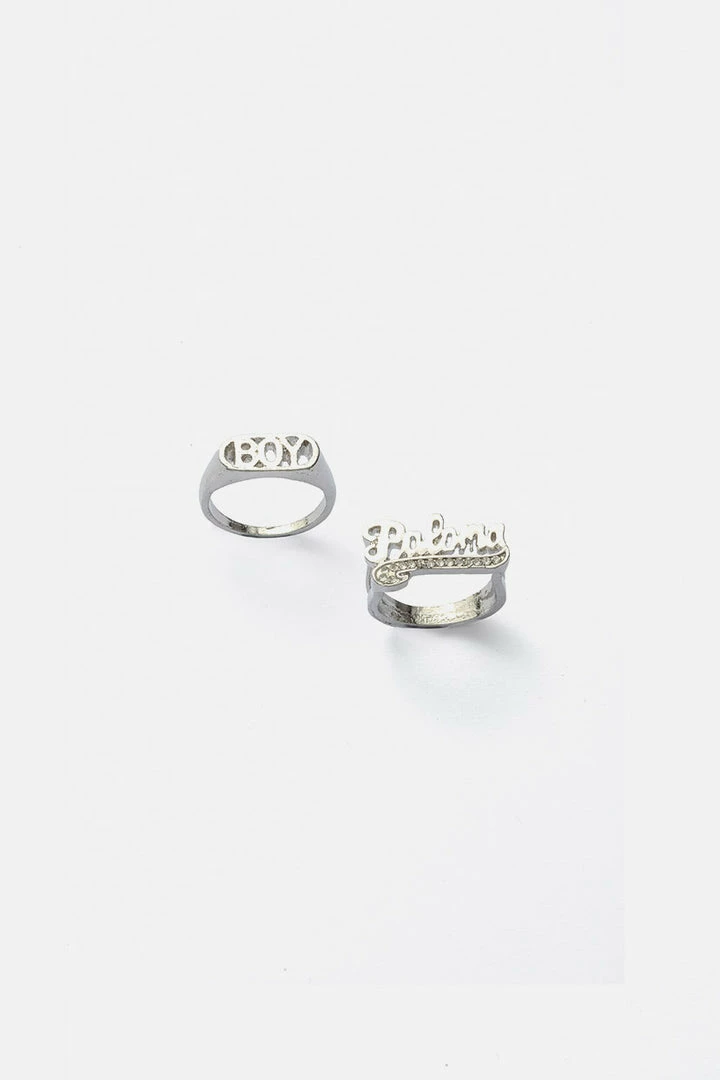 - Boy toy. A set of 2 chunky metal rings in a mixed typographic design.