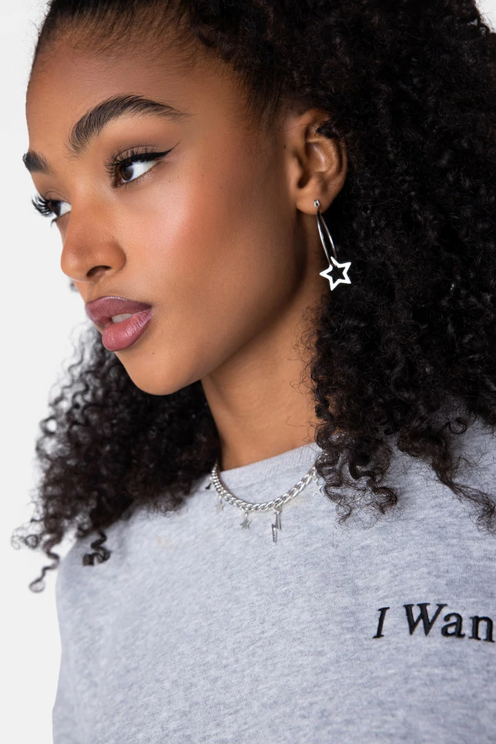 - Hoops don’t lie. Dainty hoop earrings in a metallic finish with super-cute, hollow, star shaped charm.