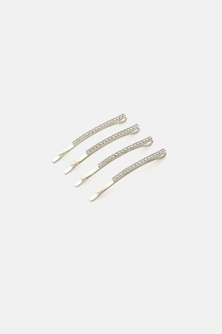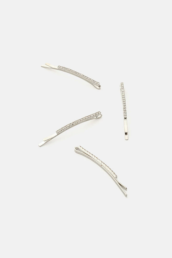 - Sparkle on. Set of 4 rhinestones embellished hair slides in a metallic finish.