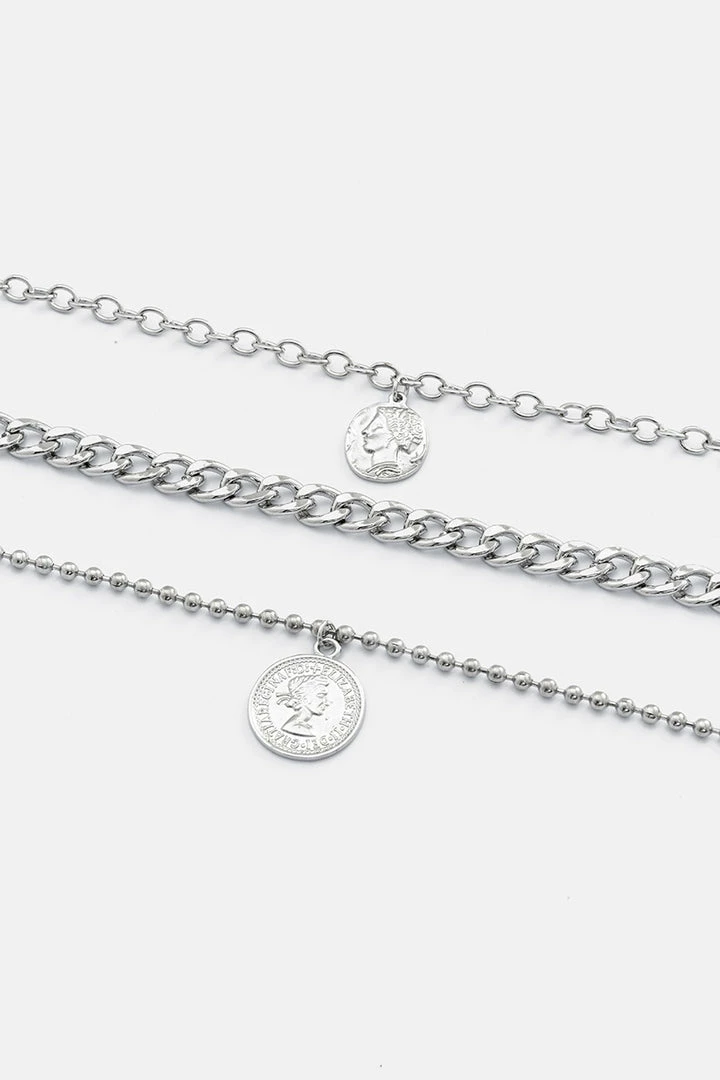 - A penny for your thoughts. Metallic finish, 3-layered necklace with two link chains, one ball chain, a pair of medallion style charms, and adjustable lobster closure.