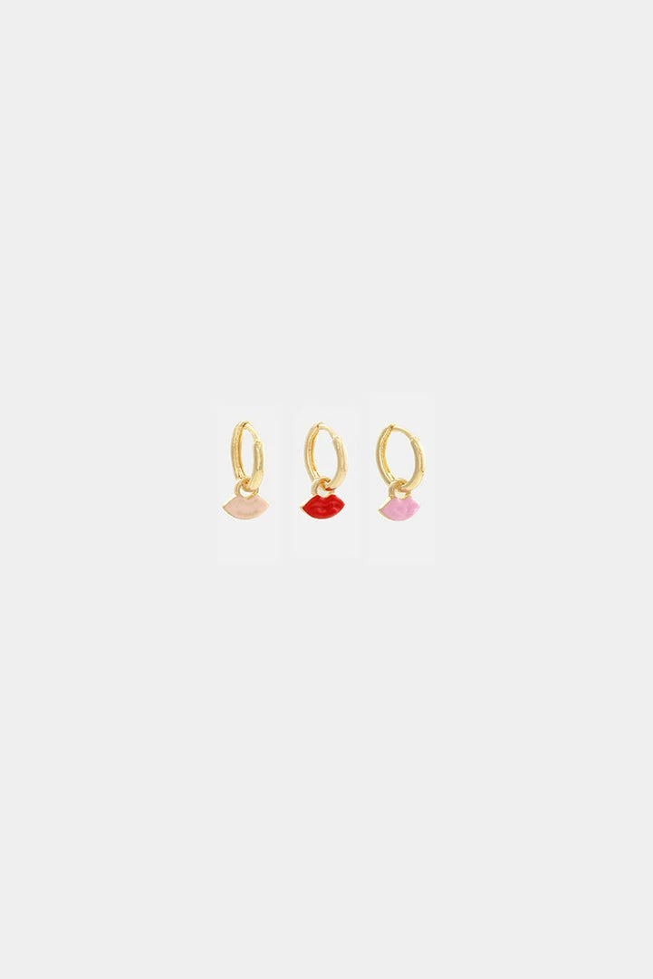 - Kiss & tell. 3-pack of mixed design, huggie hoop earrings with charms in a metallic finish.