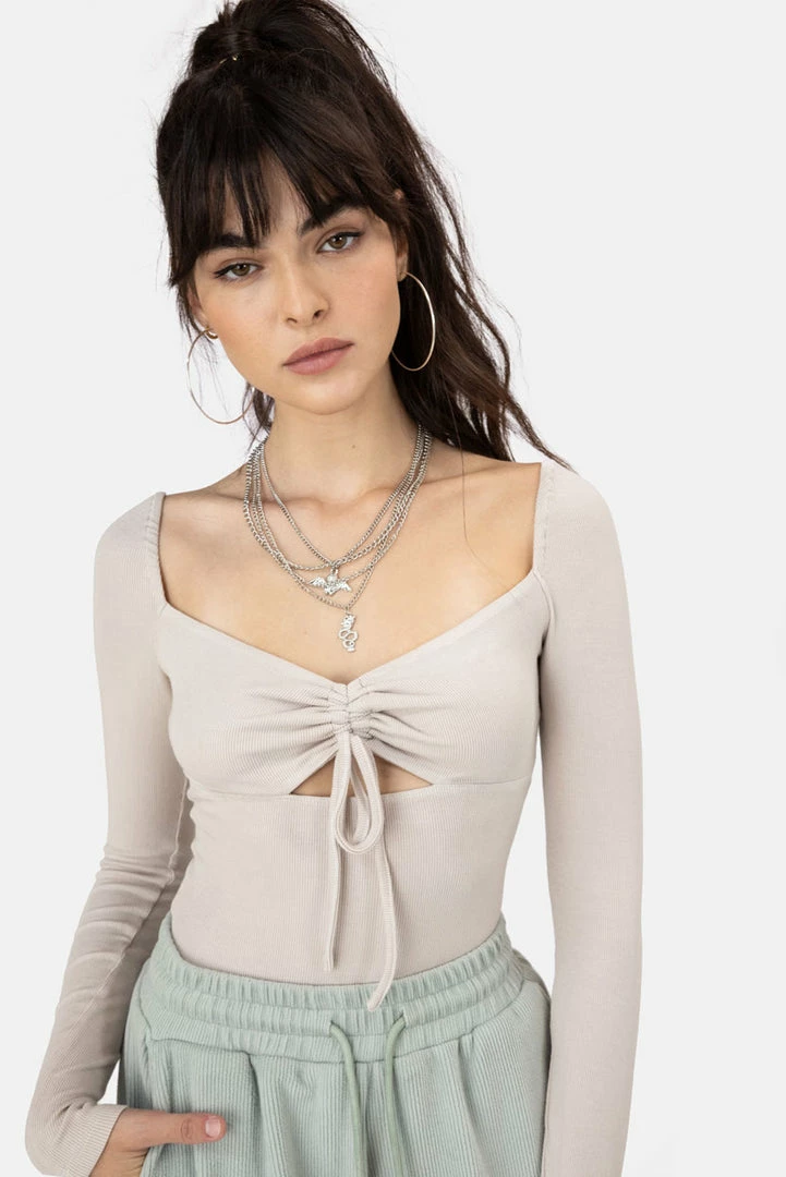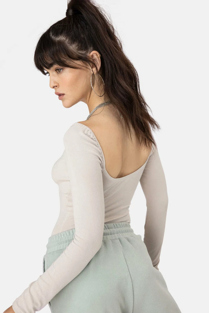 - It’s all about spicing up the classic fits. Long-sleeved bodysuit in a stretchy ribbed fabric, perfectly ruched at the chest to create a sweatshirt neckline, with a scoop back, high leg cut and snap button closure. Juice it up