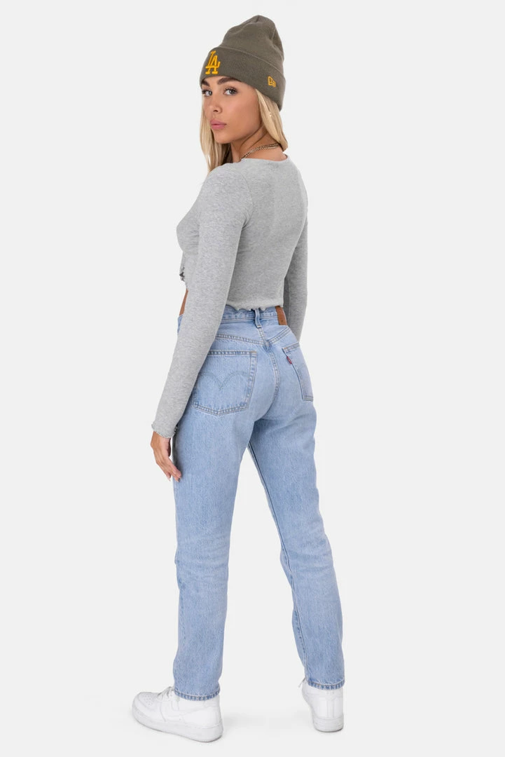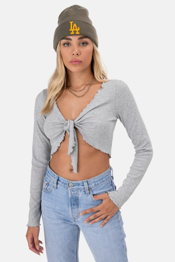 - K, drape me in this one, ASAP. Extra cropped wrap top in a t-shirt silhouette that ties in the front, featuring a deep v-neck with long sleeves and a wavy outline. It’s a wrap.