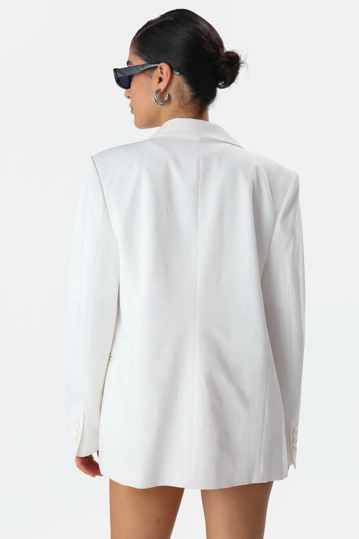 - Bossy boss lady, comin’ through. Boxy fit blazer featuring padded shoulders, notch lapels, double-breasted button closure, chest faux-pocket, side pockets and button cuffs.