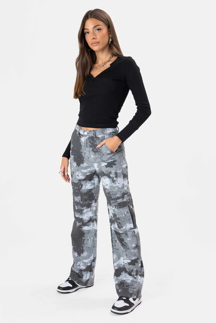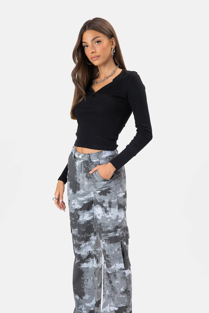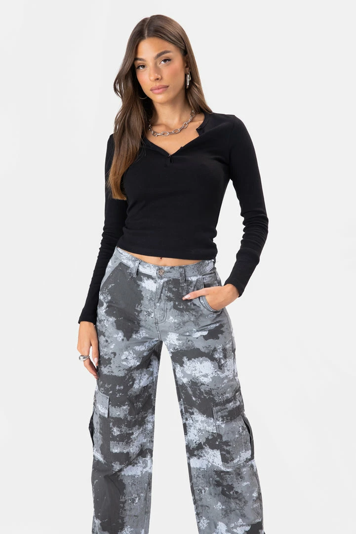 - She a basic bae. Ribbed T-shirt featuring V neckline with button detail and long sleeves.