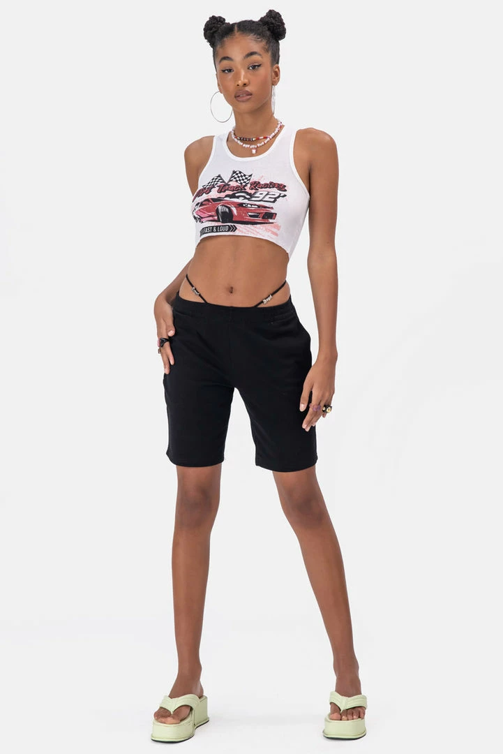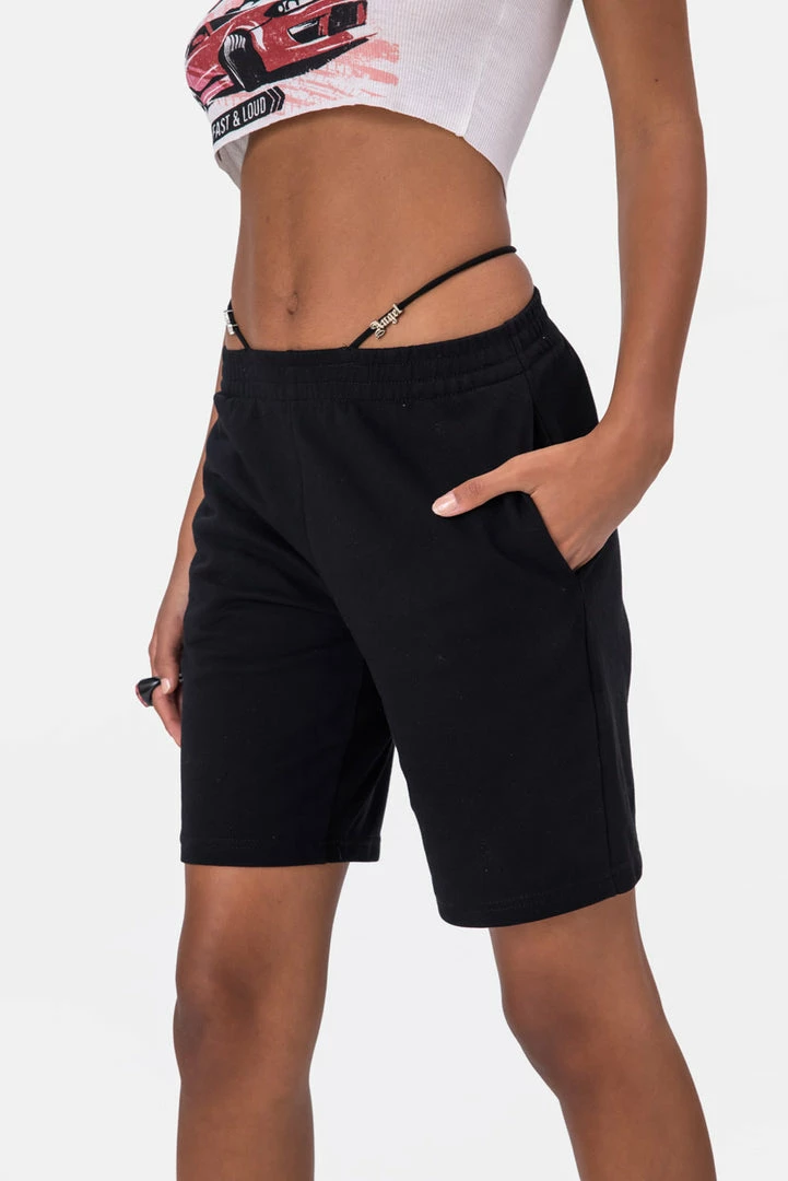- What an angel. Are you really, though? Biker shorts featuring a wide elastic waistband, front slit pockets and front-to-back waist strings with metallic typographic detail.