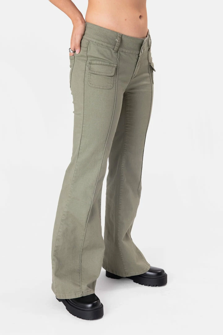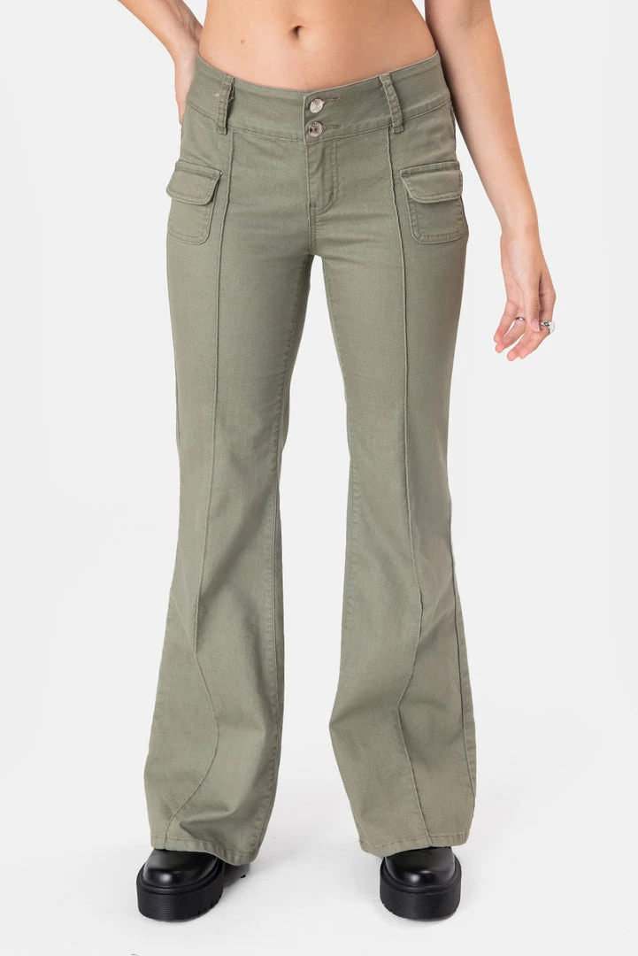 - Feelin’ like it’s 2002. Flared pants in low rise fit with button and zip closure, tonal seam detail, small front flap pockets, back patch pockets and belt loops.