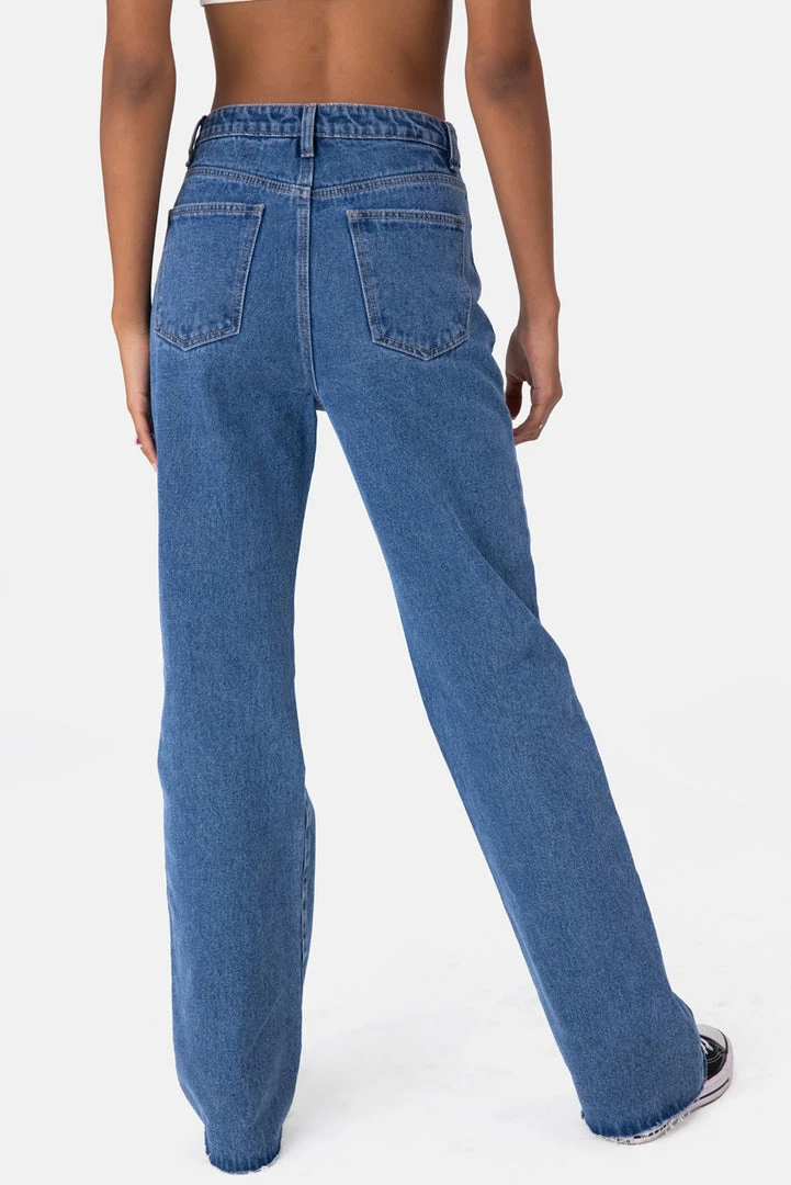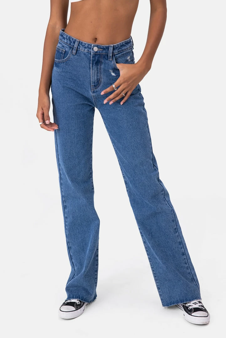 - Carpe denim. Wide leg and high waisted jeans with small distressed details in the front, classic button and zip closure, 5-pocket design, belt loops and raw-cut hem.