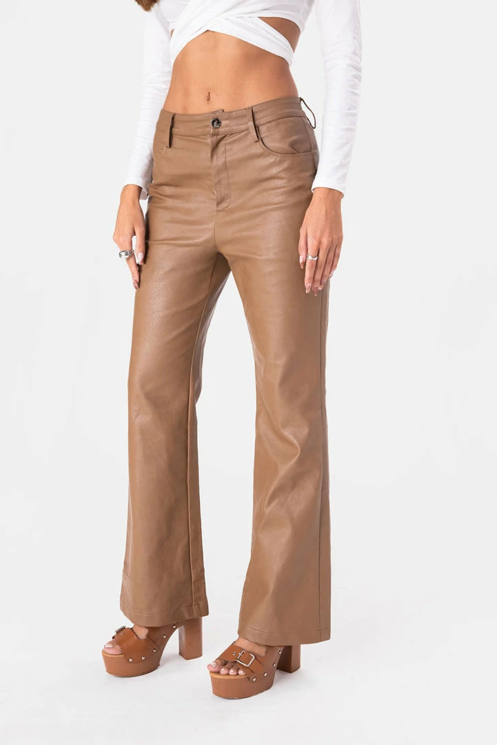 - Heard you a slayer. Mid rise, faux leather pants in a wide fit with button and zip closure, front round pockets, belt loops and back patch pockets.