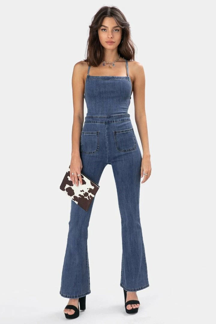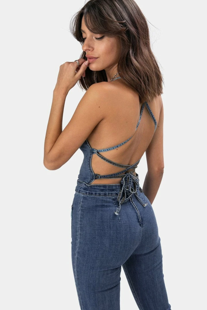 - Always got your BACK! Super chic denim jumpsuit cut very close to the body, featuring halter neck and exposed back with criss-cross design, flare leg bottom