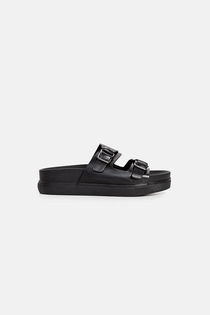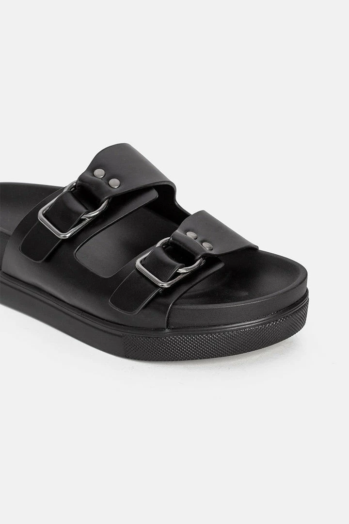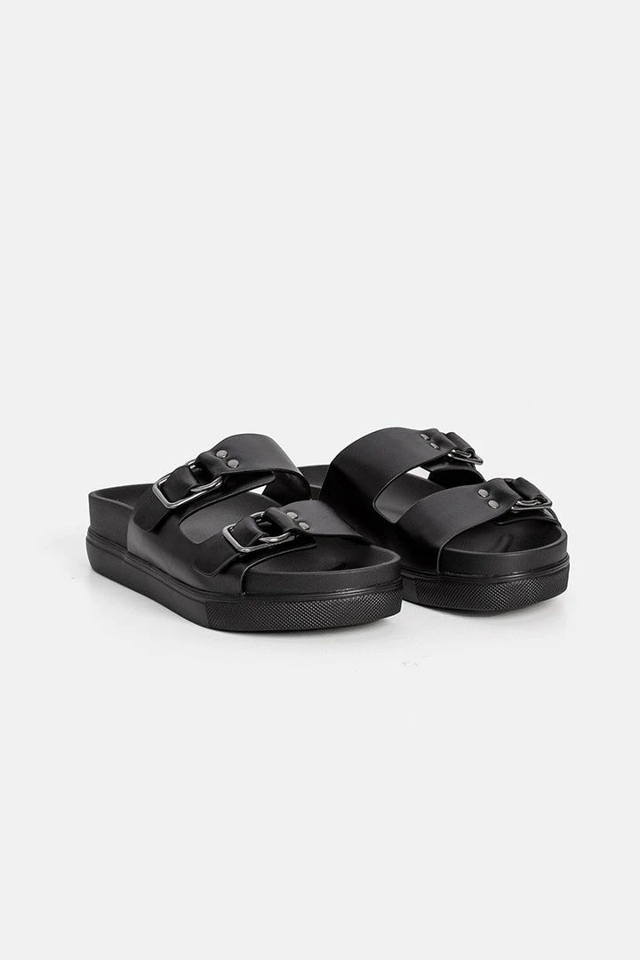 - Slide and ride. Slip-on, open-toe faux leather sandals featuring double straps with buckle closure and a comfy sole.
