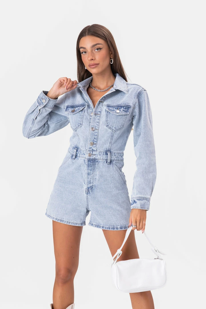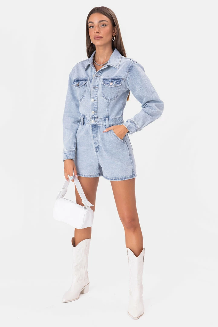 - Pick a blue. Denim romper in light wash with button closure, classic collar and long sleeve with button cuffs. Including chest flap pockets, fitted waist with belt loops, diagonal front pockets and back patch pockets.