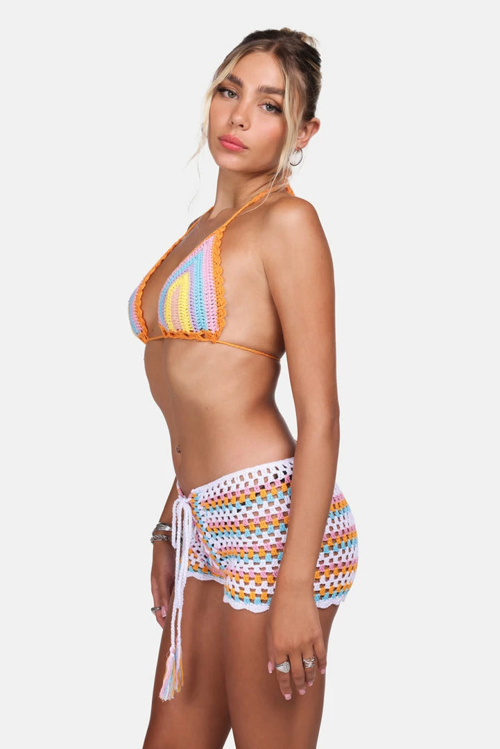 - Serious summer feels. Crochet knit shorts in colorful stripes all-over featuring criss-cross tie closure with tassel embellishments.