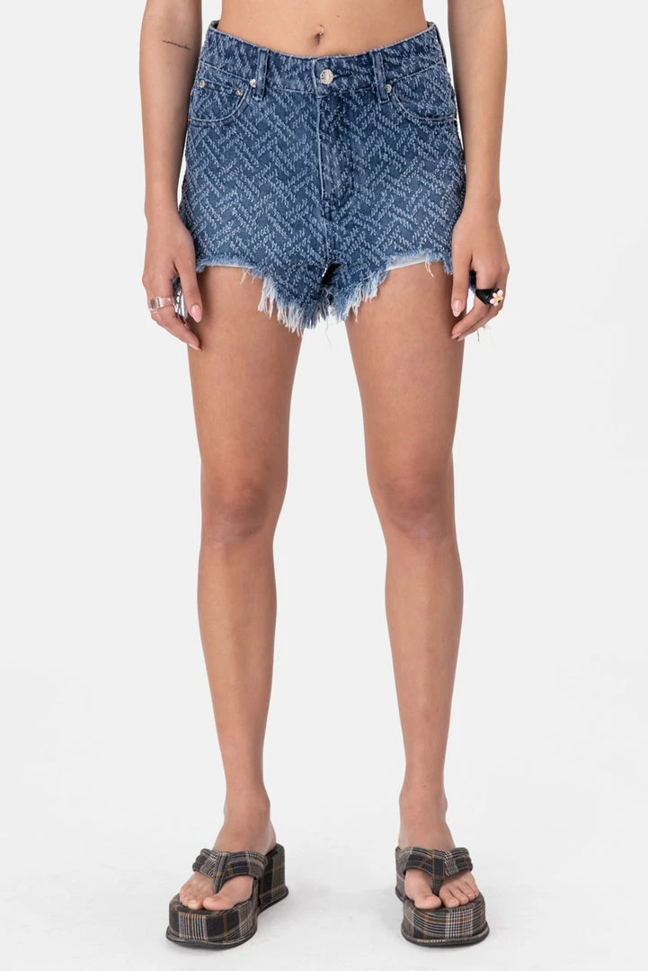 - Short and super chic. High-waisted denim shorts with distressed pattern all-over, button and zip closure, belt loops, front round pockets, back patch pockets and a fringed hem.