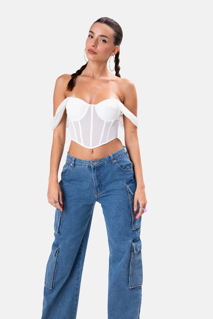 - Romance isn’t dead. Off-shoulder corset top in sleek mesh fabric featuring cup detail with underwire, corset bones all-over and back zip closure.