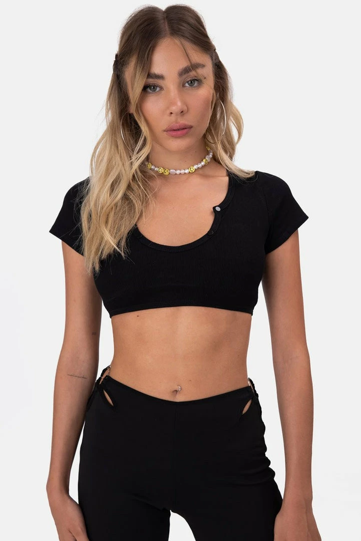- Yes girl, you just found the one: super cropped top with a low-cut neckline and snap button detail.