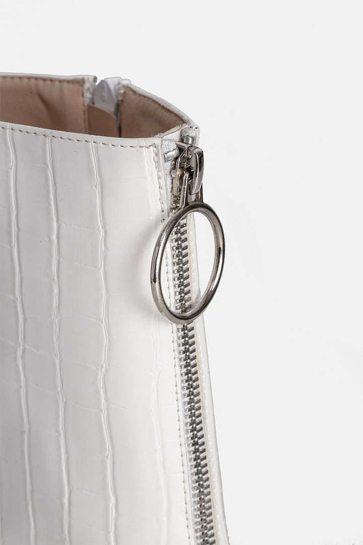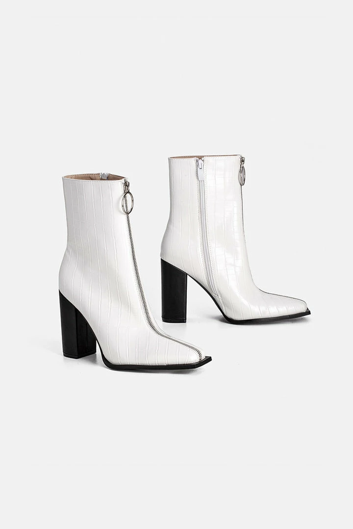 - Heading out? Then you need these shoes. Textured, faux leather, pointed-toe ankle booties featuring super-edgy zip detail in the front, chunky contrasting heel, and side-zip closure. Chic!