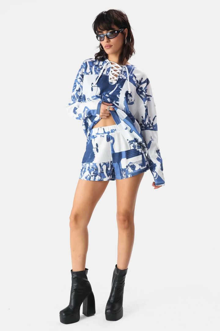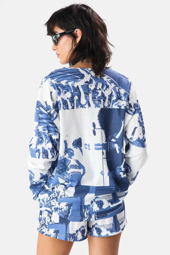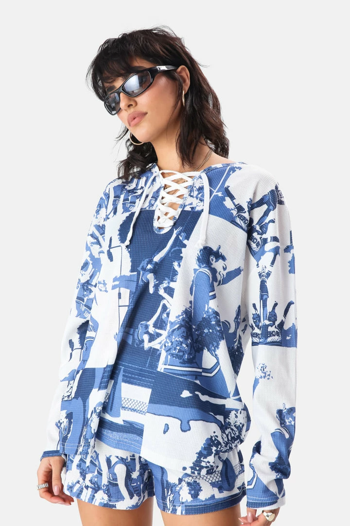 - Blinded by the vibe. Oversized shirt in waffle textured fabric and mega-street print all-over. Including crewneck with lace-up detail, long sleeves and dropped shoulder line.