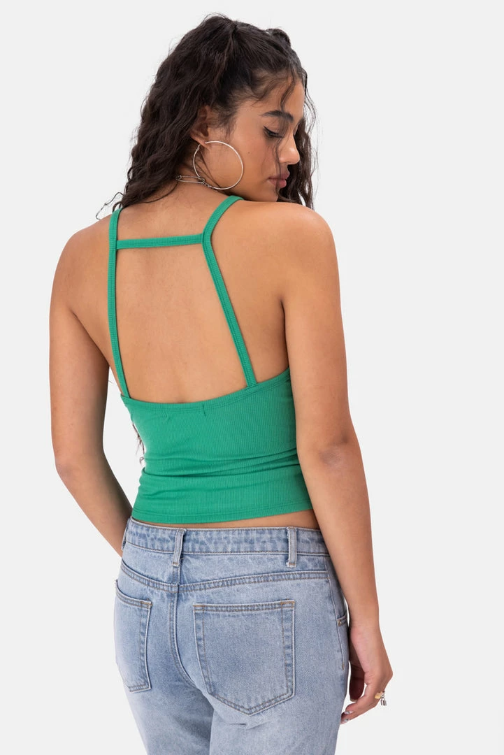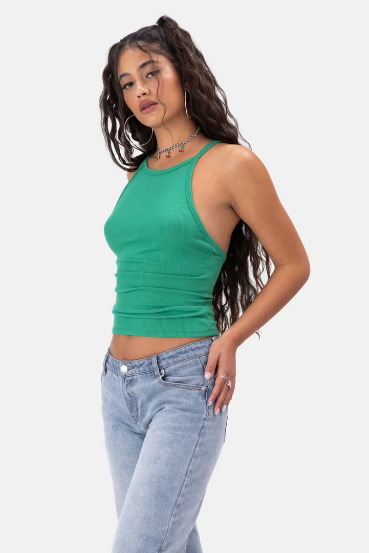 - Right back at ya, hun. Sleeveless, fitted ribbed top with cut-out detail in the back, round neck and low arm cut.