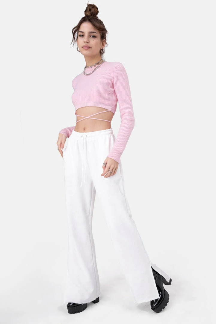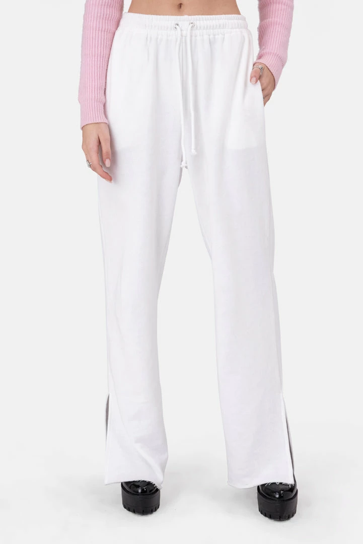 - So fun for all sorts of look combinations! Flared sweatpants in a high-waist fit featuring an elastic waistband with drawstring, side inseam pockets, side slits at the cuffs and a raw-cut hem for that edgy finish. NEED.