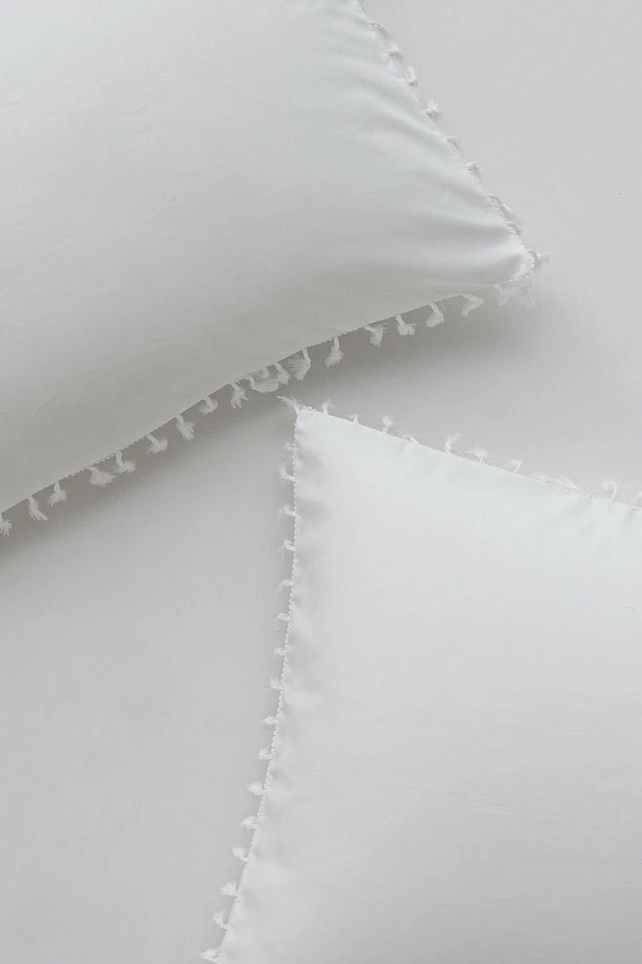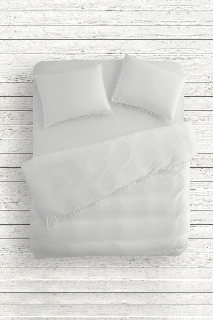 - Staycay anyone? Queen set featuring tassel detail with one duvet cover, one fitted sheet and two pillowcases.