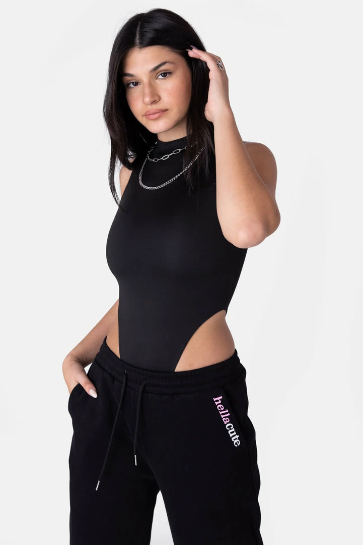 - All about that side chic. Sleeveless stretchy bodysuit with super high-leg design, high neck and a hidden snap button closure