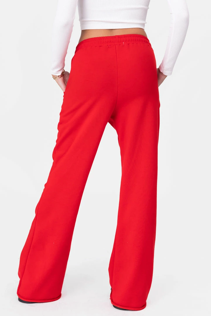 - Don’t sweat it. Flared sweatpants in a high-waisted fit featuring an elastic waistband with drawstring, side diagonal pockets and raw-cut hem.