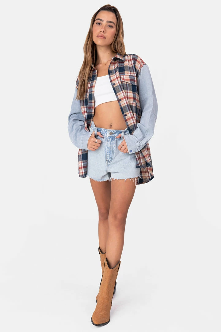 - Mixin’ it up a bit. Oversized plaid flannel shirt with contrasting denim-sleeves, buttons closure, classic collar, chest flap pocket and button cuffs.