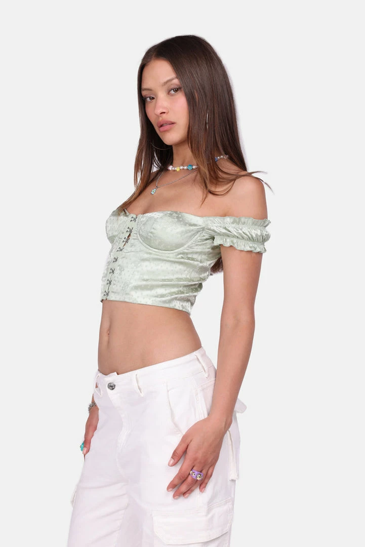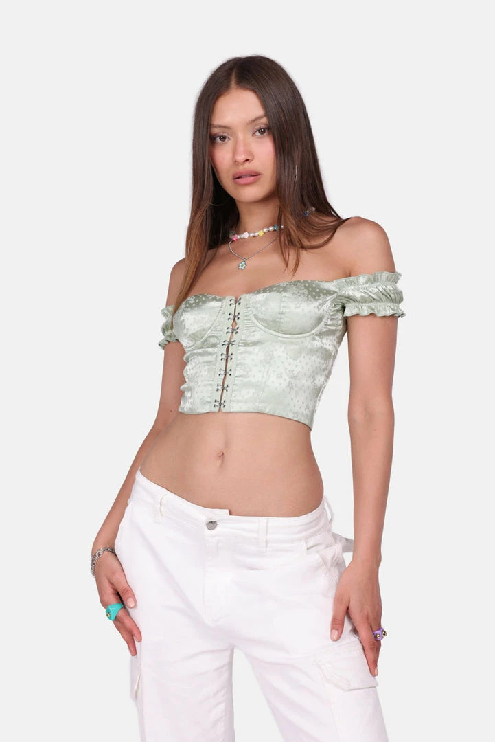 - Dearest gentle reader. Off-shoulder cropped top in corset fit, cups with bra wire, ruffled sleeves, eye and hook closure satin finish jacquard