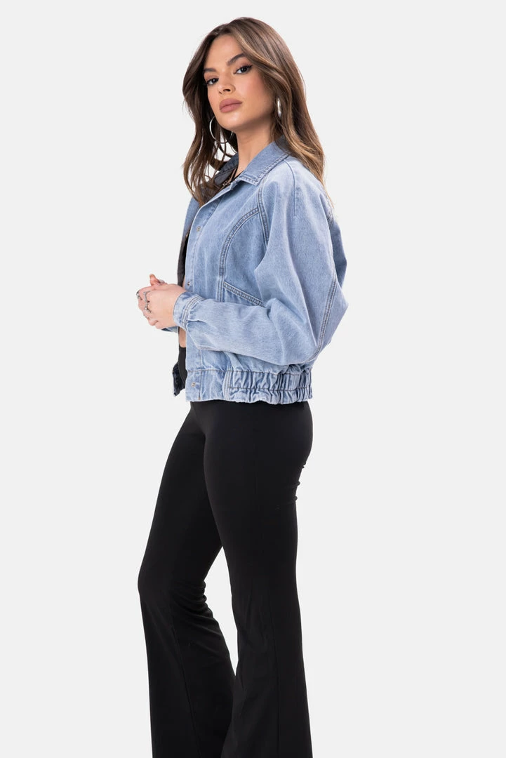- The ’80s called. Denim jacket with snap button closure, classic collar and front button pockets. Including long sleeves with button cuffs, elastic hem and mega stylish seam detail.