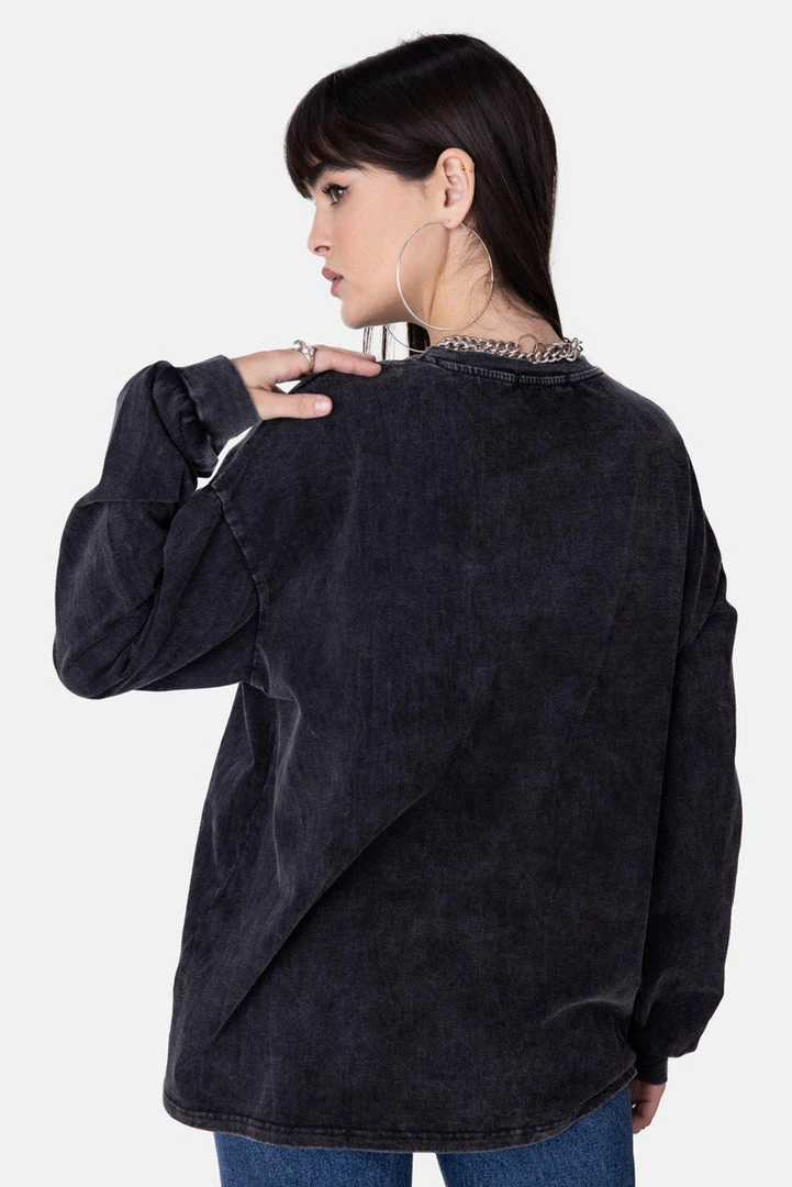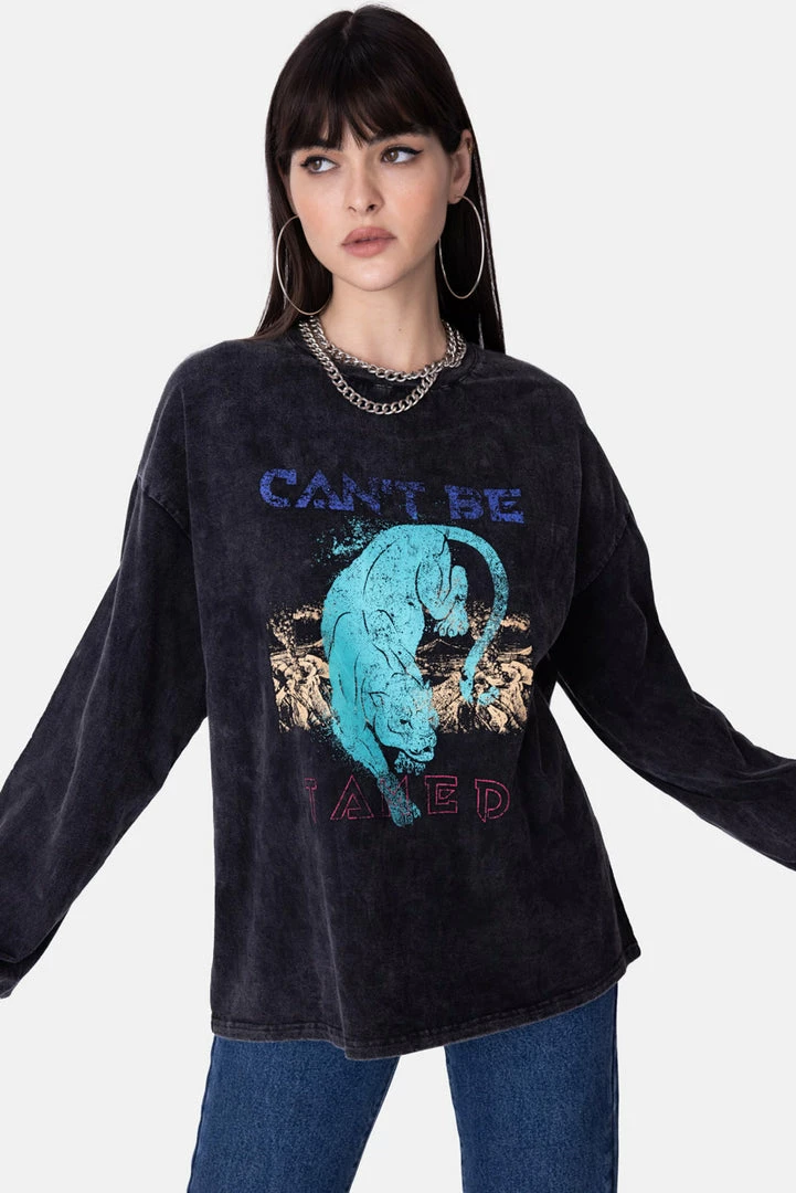 - Here, kitty, kitty. Relaxed fit, washed t-shirt with long sleeves, vintage-style graphic print on the front, dropped shoulder line, round neck and fitted cuffs.