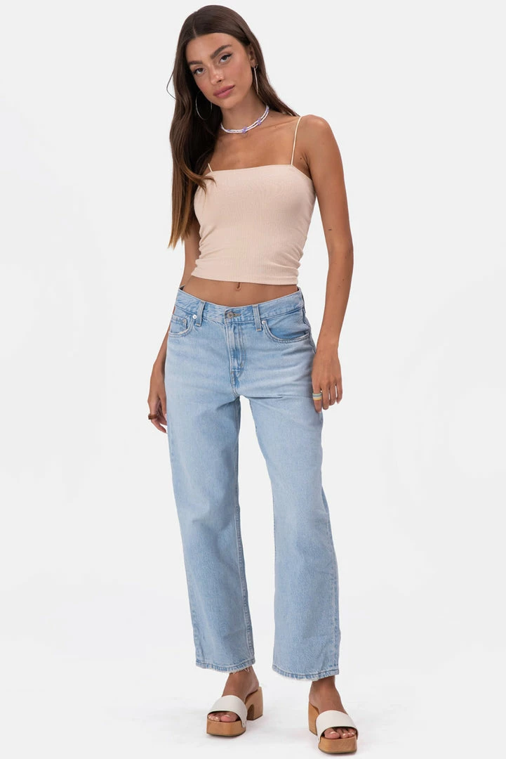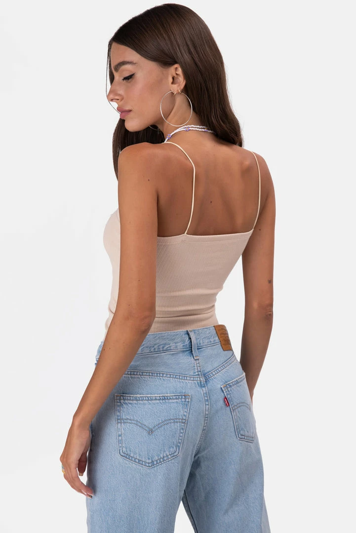 - Tip-top. Bodycon ribbed top with thin, stretchy shoulder straps and square neck.