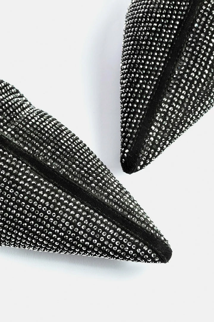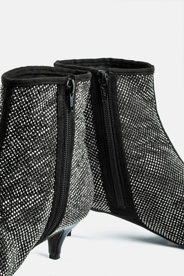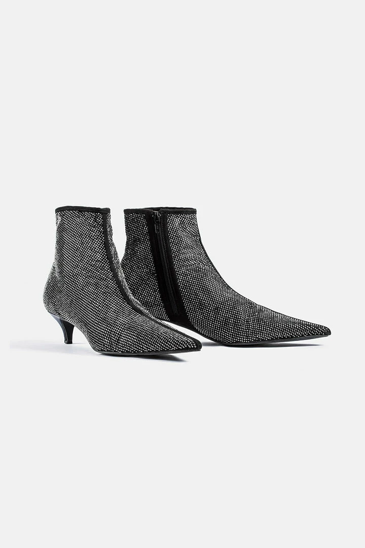- Fabric pointed-toe booties featuring all-over studded shine detail, kitten heels and side zip closure