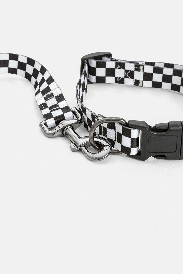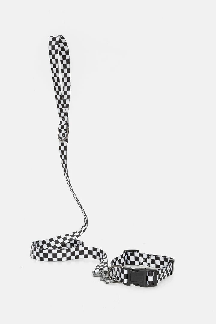 - Check it out. Adjustable dog collar in all-over checkered print with plastic buckle closure and metal ring. Including a matching leash with an easy-grip handle and a metal lobster clasp.