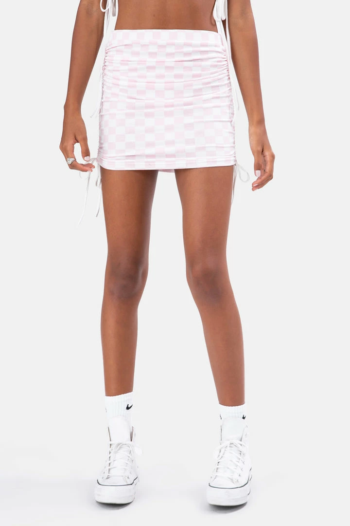 - Checkmate! Miniskirt in a checkered print with ruched sides and tie strings.