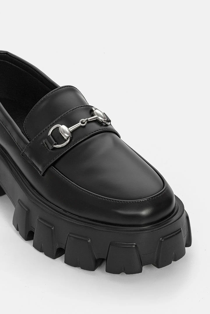 - Climb on up. Faux leather, slip-on, loafers with stylish, snaffle detail, almond toe, apron front and chunky sole.