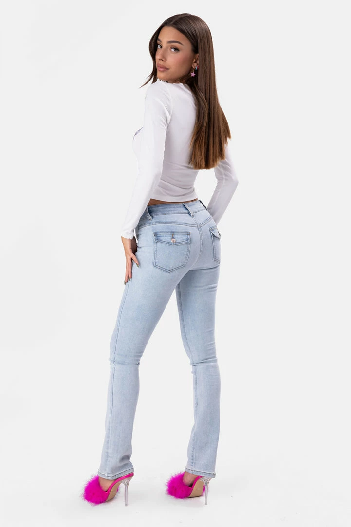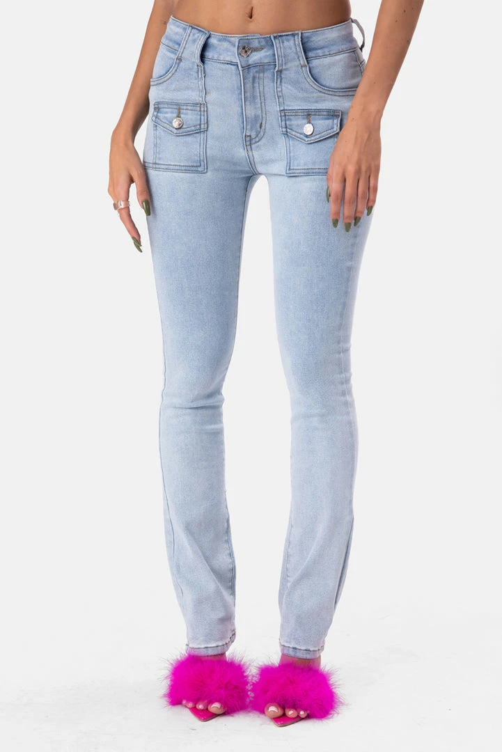 - It’s in-jean-ious. Light wash skinny jeans in low-rise and straight leg fit with a button and zip closure. Including button-flap pockets in the front and back, front round pockets and belt loops.