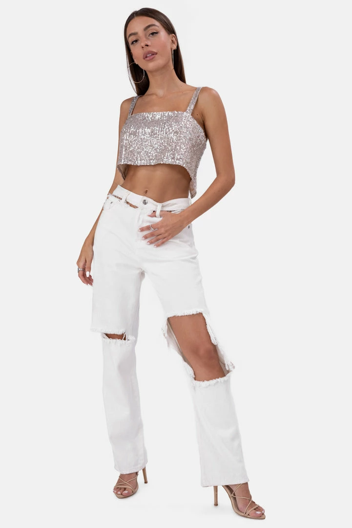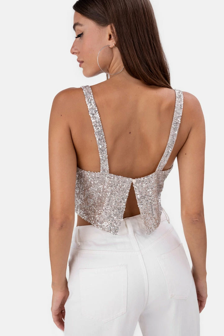 - Shine on, you crazy diamond! This cropped top features all-over tiny sequin embellishment, a square neckline at the front and back and a single-button closure at the back.