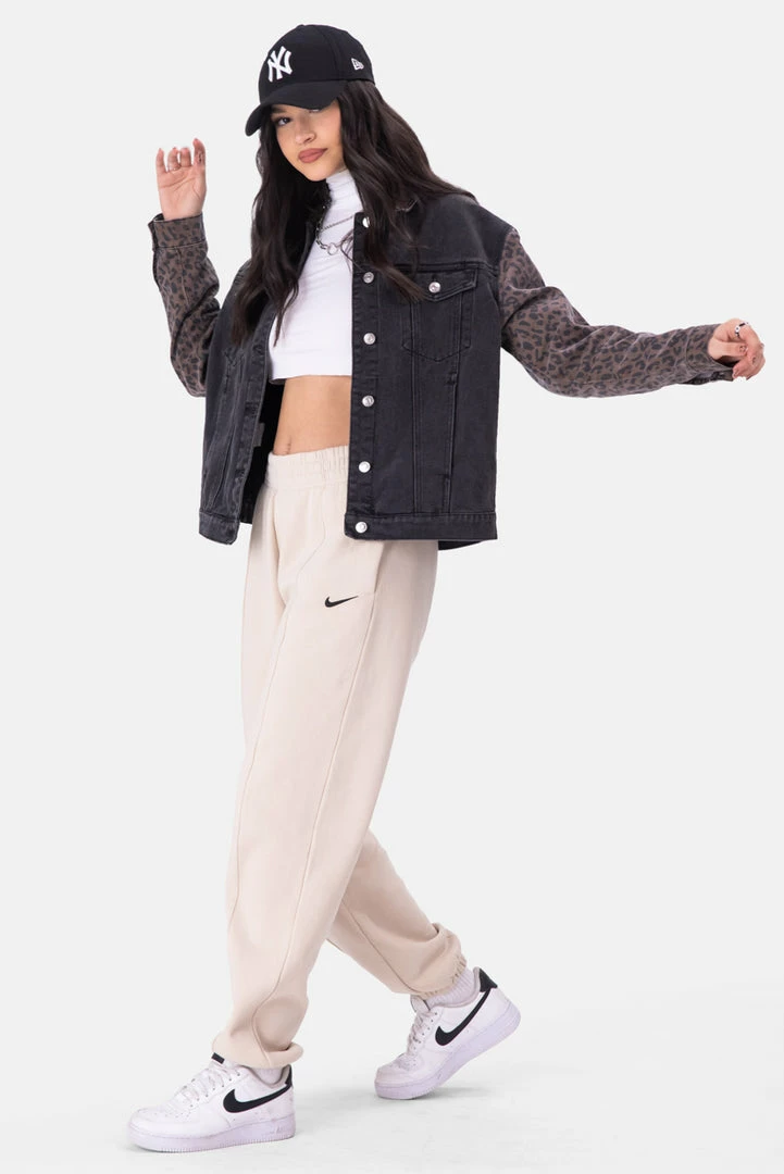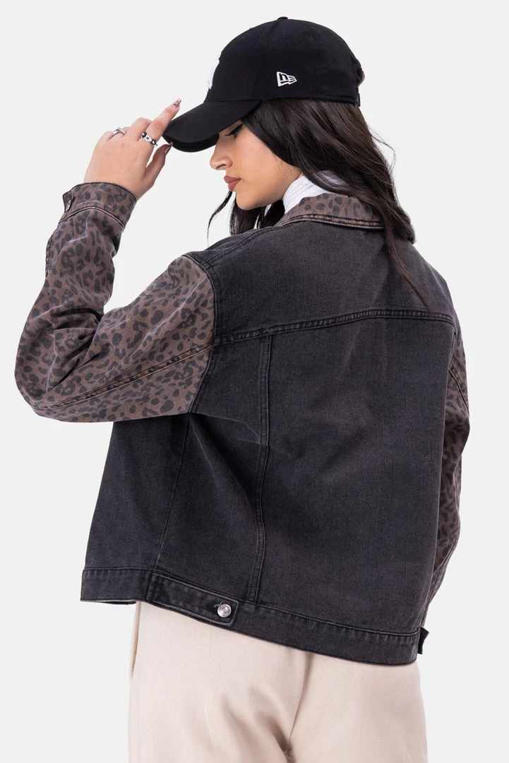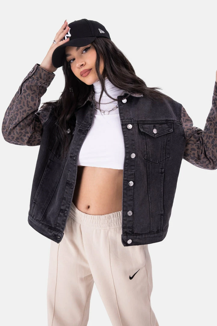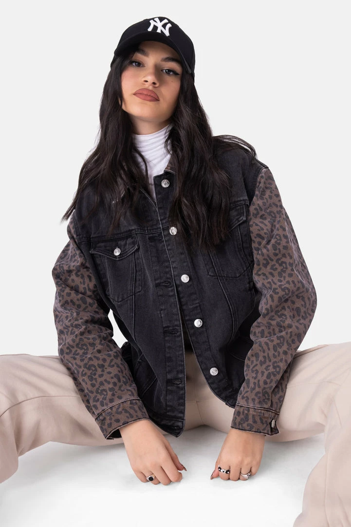 - Spot on denim. This denim jacket comes in a semi-oversized fit with leopard print sleeves and a classic collar. Including button closure, chest flap pockets, side inseam pockets and single-button cuffs.