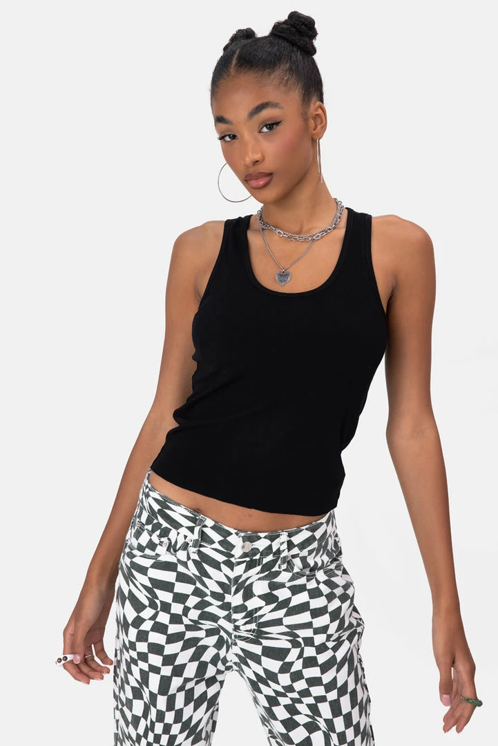 - To go with literally everything. Sleeveless ribbed top with scoop neck and raw-cut hem.