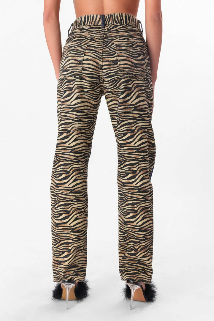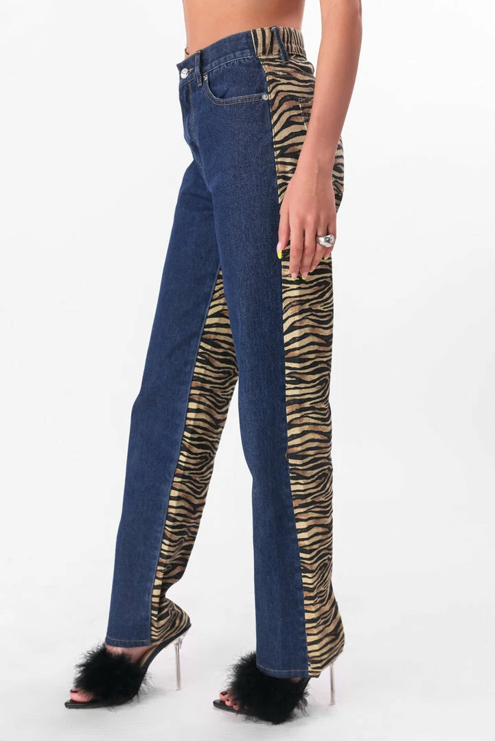 - Mood swings for life. High waisted jeans in mega unique design featuring classic denim front and tiger print back design. Including straight leg, button and zip closure, belt loops and 5-pocket design.