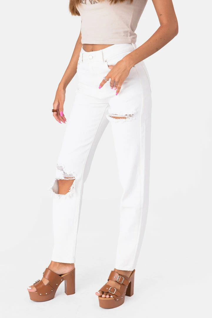 - Classy meets edgy. High waisted, mom fit, jeans with distressed detail in the front, button and zip closure, belt loops, 5-pocket design and cropped hem.