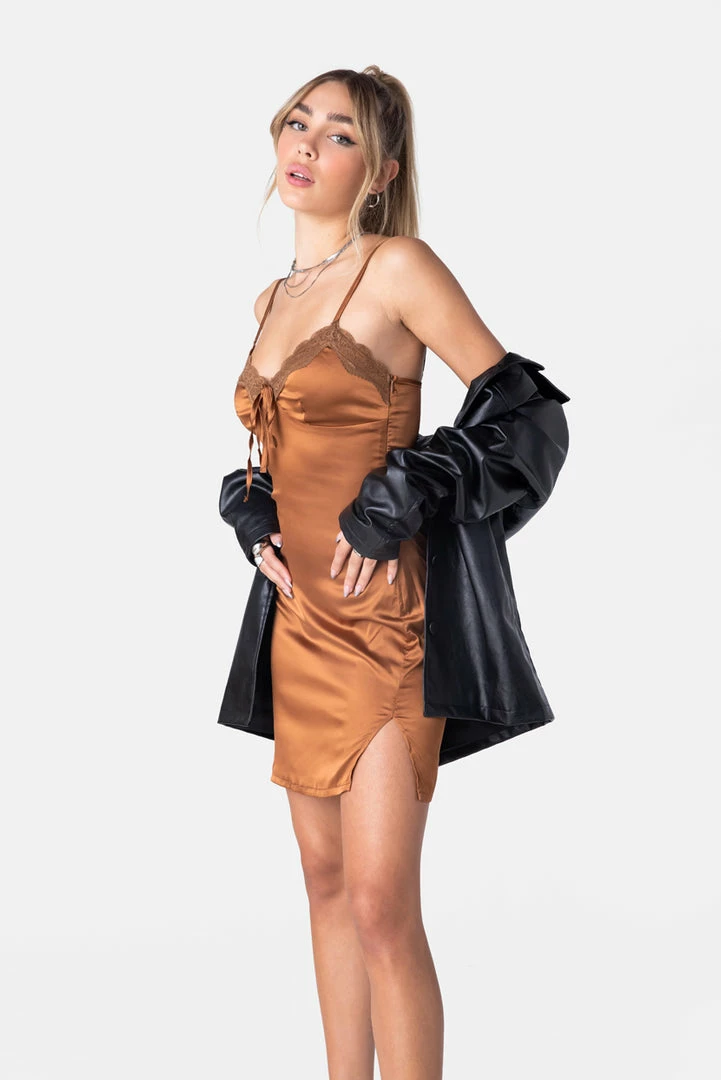 - Slip into it. Slip-on, mini dress in satin-finish featuring a sweetheart neckline with lace trim and tie detail, adjustable spaghetti straps and side slit.