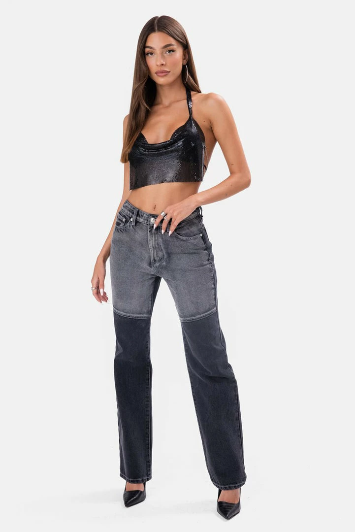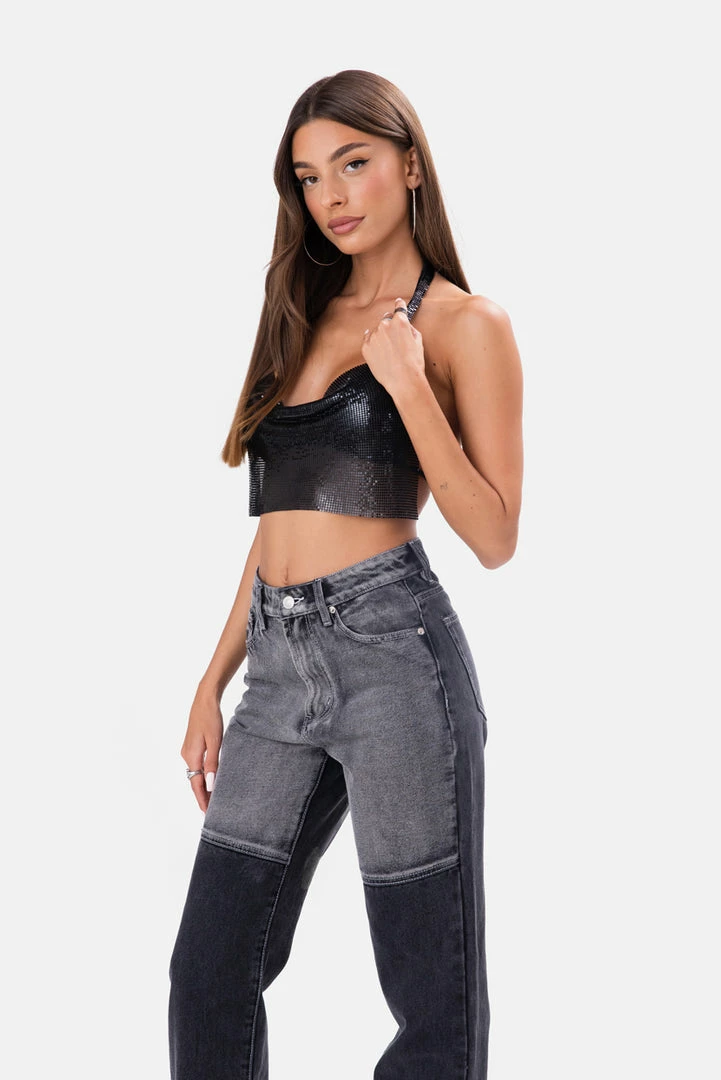 - Hey, glow digger. Super unique crop top in chainmail featuring a cowl neckline and halter straps with metal chain closure. Including detachable and adjustable chain straps around the open back, with lobster clasp closure.