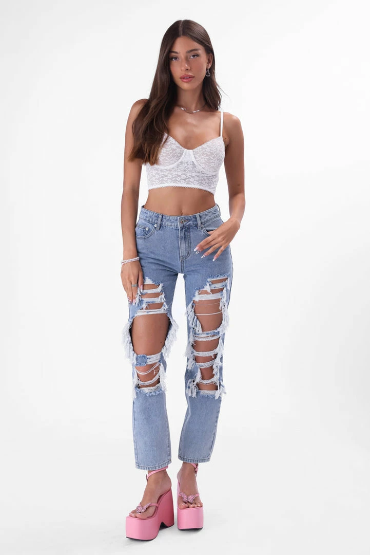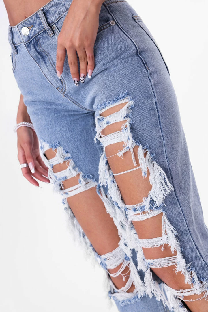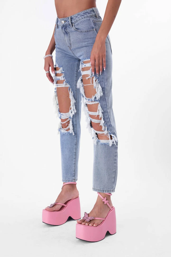 - Bring on the edgy vibes. High waisted straight fit jeans with mega distressed front, button and zip closure, belt loops and 5-pocket design.