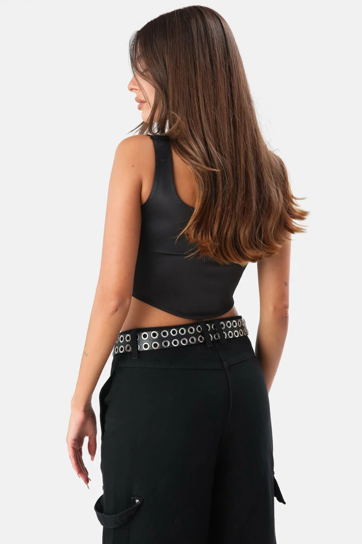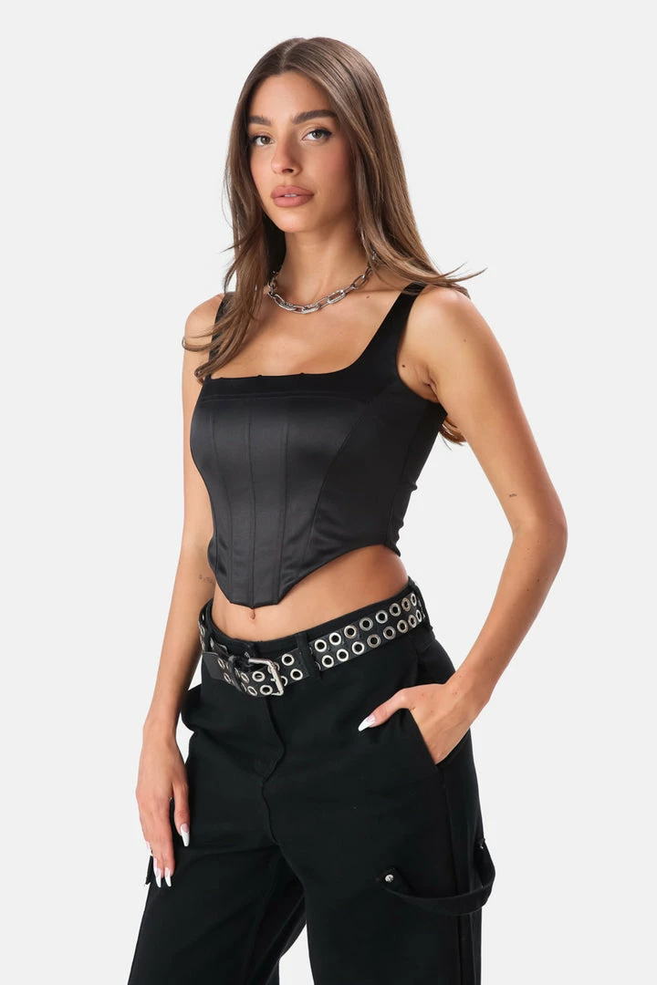 - Super sass but classy. Corset style, sleeveless top in satin finish with square neckline and corset bones for that perfect support.
