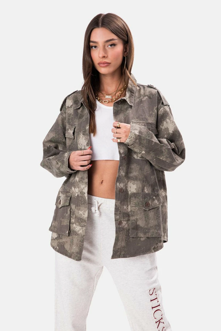 - Playin’ hide ‘n seek. Oversized jacket in all-over camouflage print featuring a classic collar and button closure. Including multi flap pockets on the front, button cuffs, shoulder epaulets and button strap on cuffs.