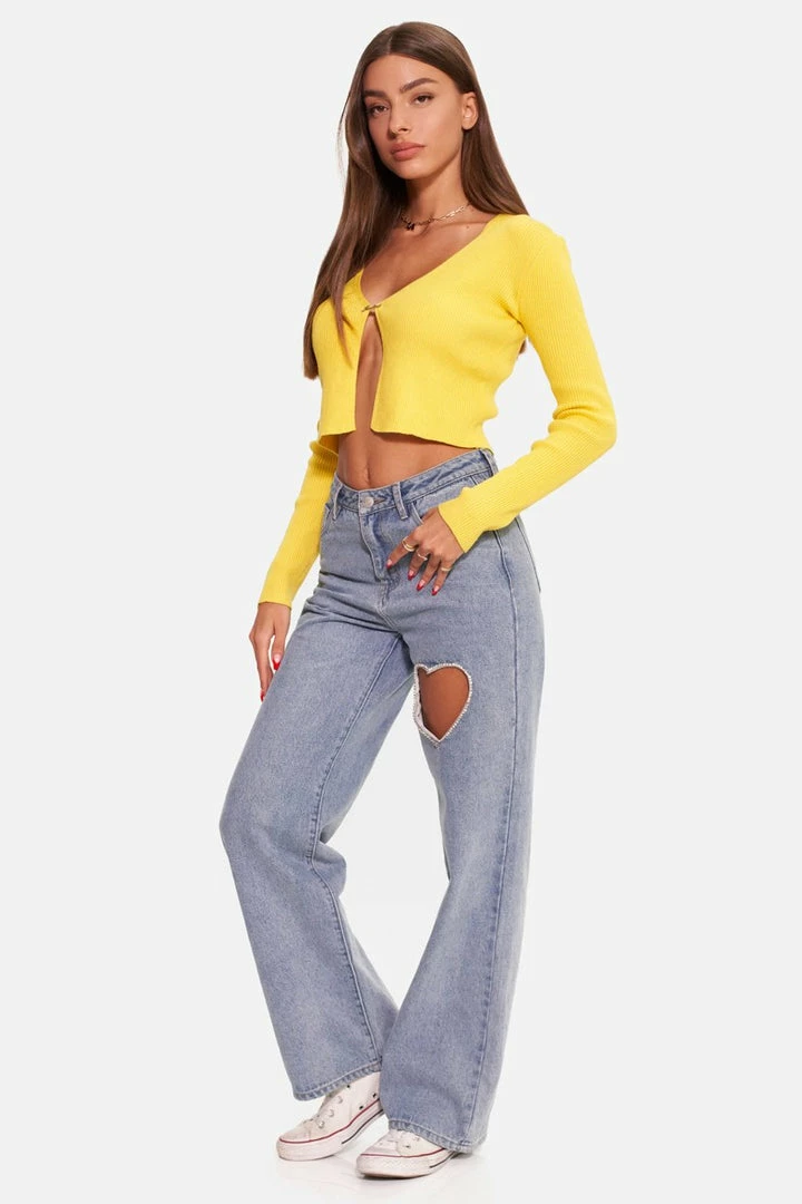 - An angel in disguise. Cardigan style ribbed top in a cropped fit with stylish metallic detail in the front and V-neck.