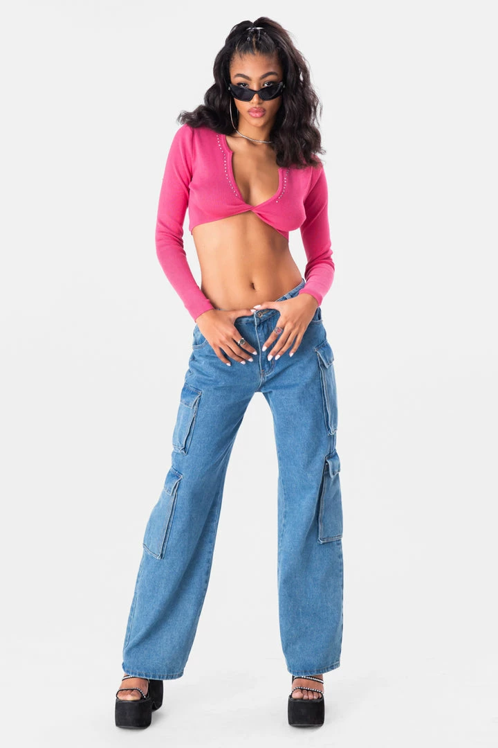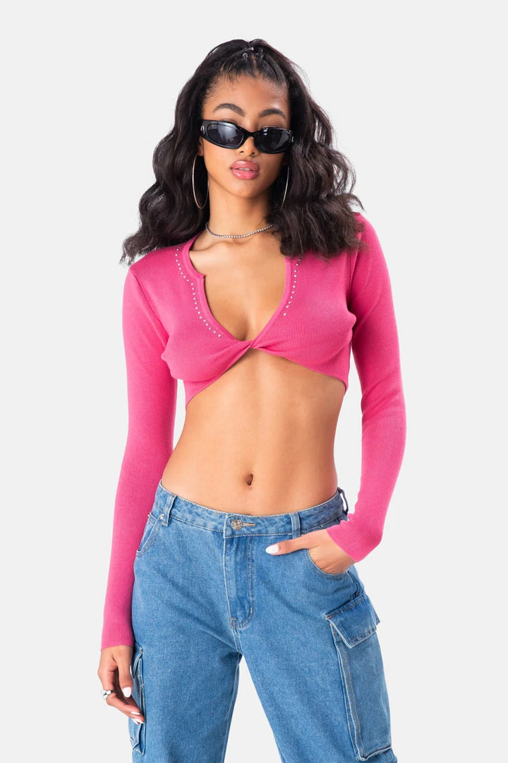 - Wknd plans ready. Rib knit crop top featuring rhinestone detail on the front and back, V neck with twist detail and long sleeves.