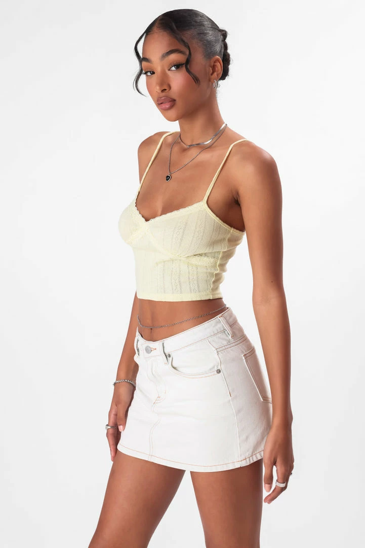 - Cute aesthetic is life. Cropped cami top with lace detail on the front, adjustable spaghetti straps and sweetheart neckline.